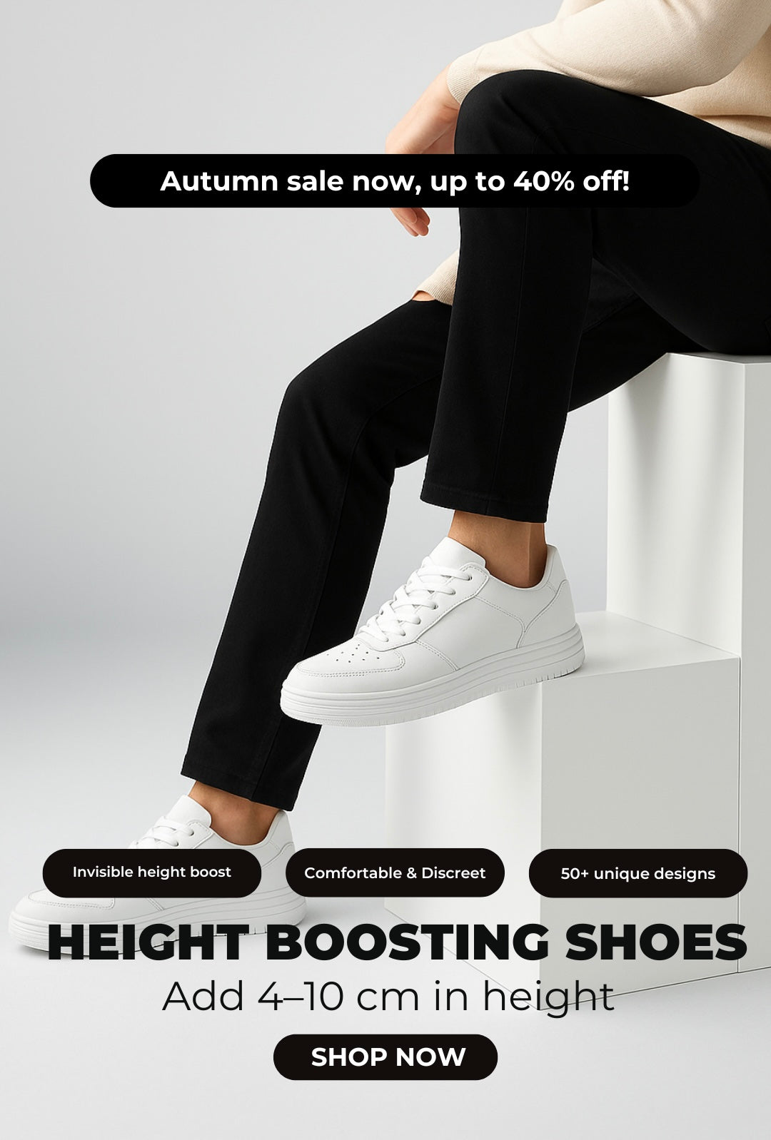 Does your height affect your daily life? Our shoes feature a hidden lift that can increase your height by up to 10 cm, depending on the model. The elevation is subtle and completely invisible from the outside. Order your new pair today and experience the difference — more height, more confidence.